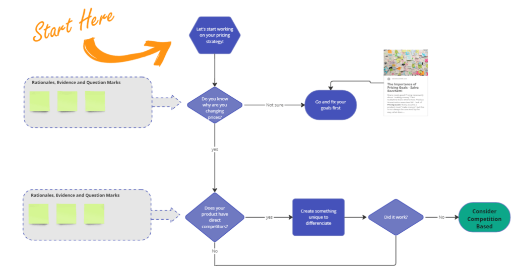 That’s exactly what the Pricing Strategy Navigator does! Like navigating a maze, you begin from the “Start box” and follow the arrows. By answering questions about your product, you will be guided through the options available to you.